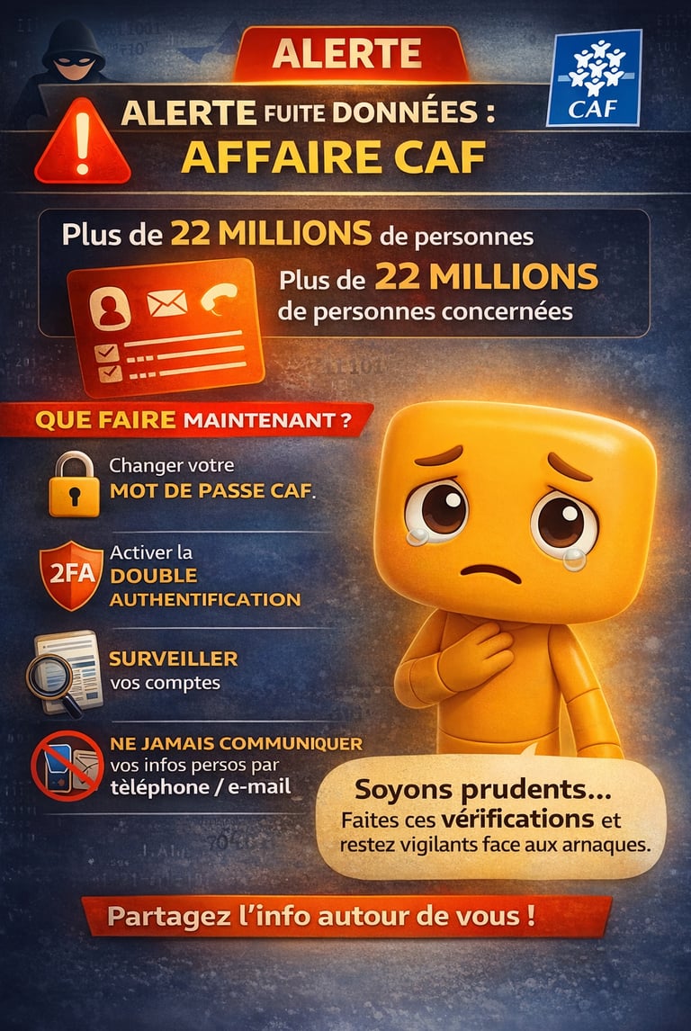 Ces derniers jours, une information sérieuse circule dans les médias et sur les réseaux sociaux : une fuite massive de données personnelles issues de la Caisse d’Allocations Familiales (CAF) pourrait concerner plusieurs millions de personnes en France.